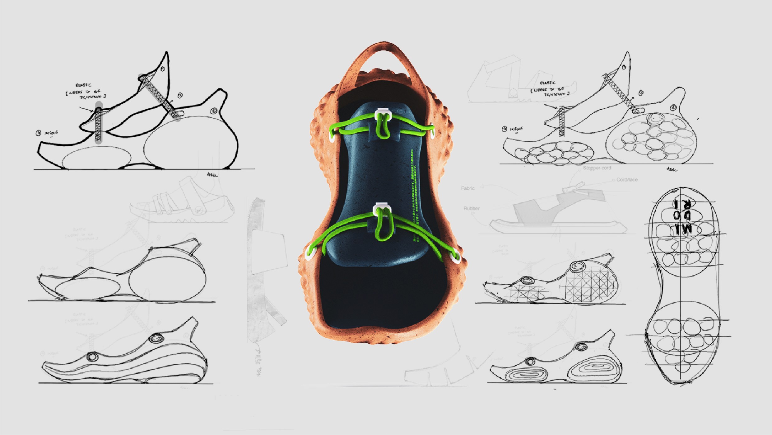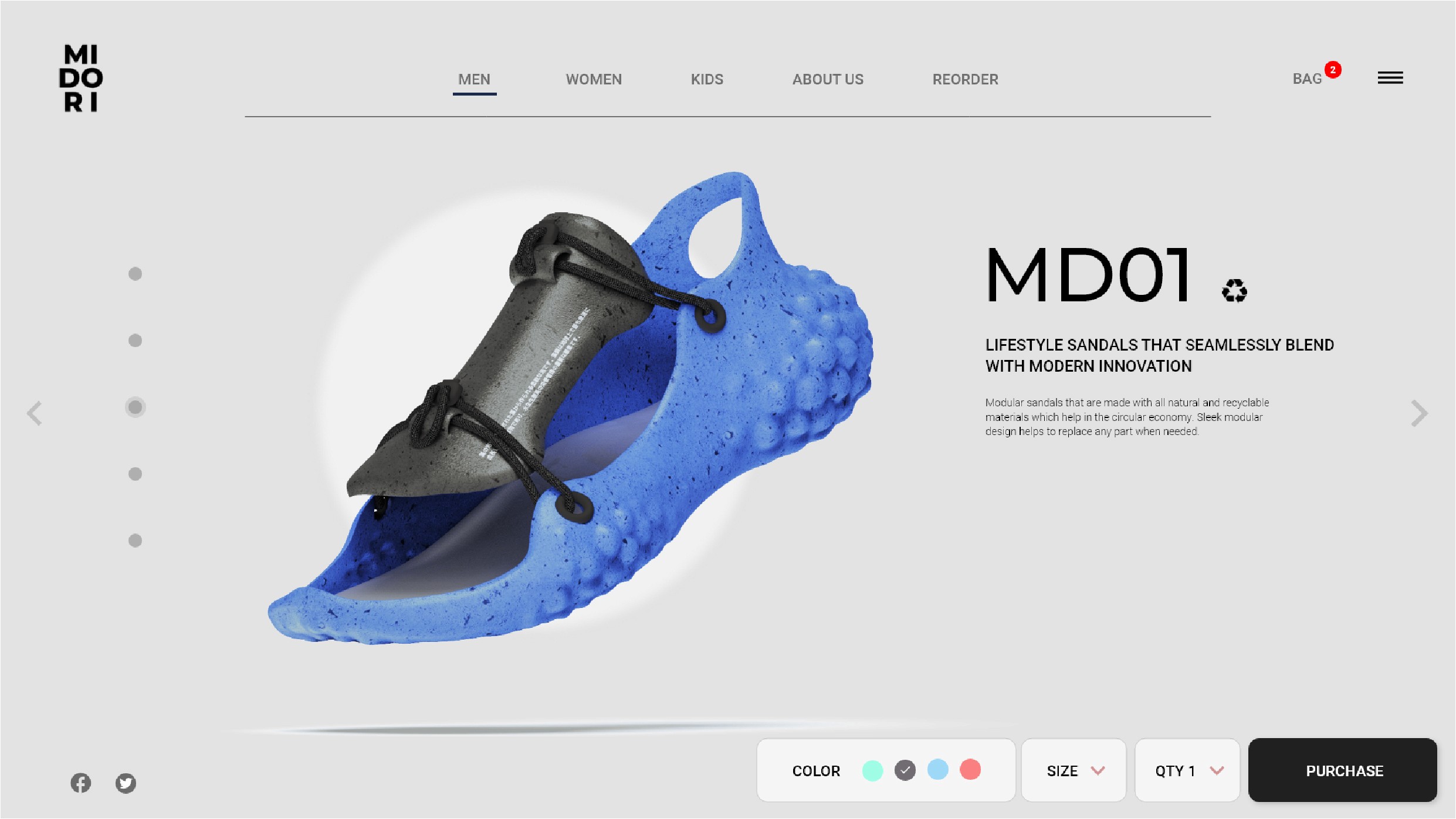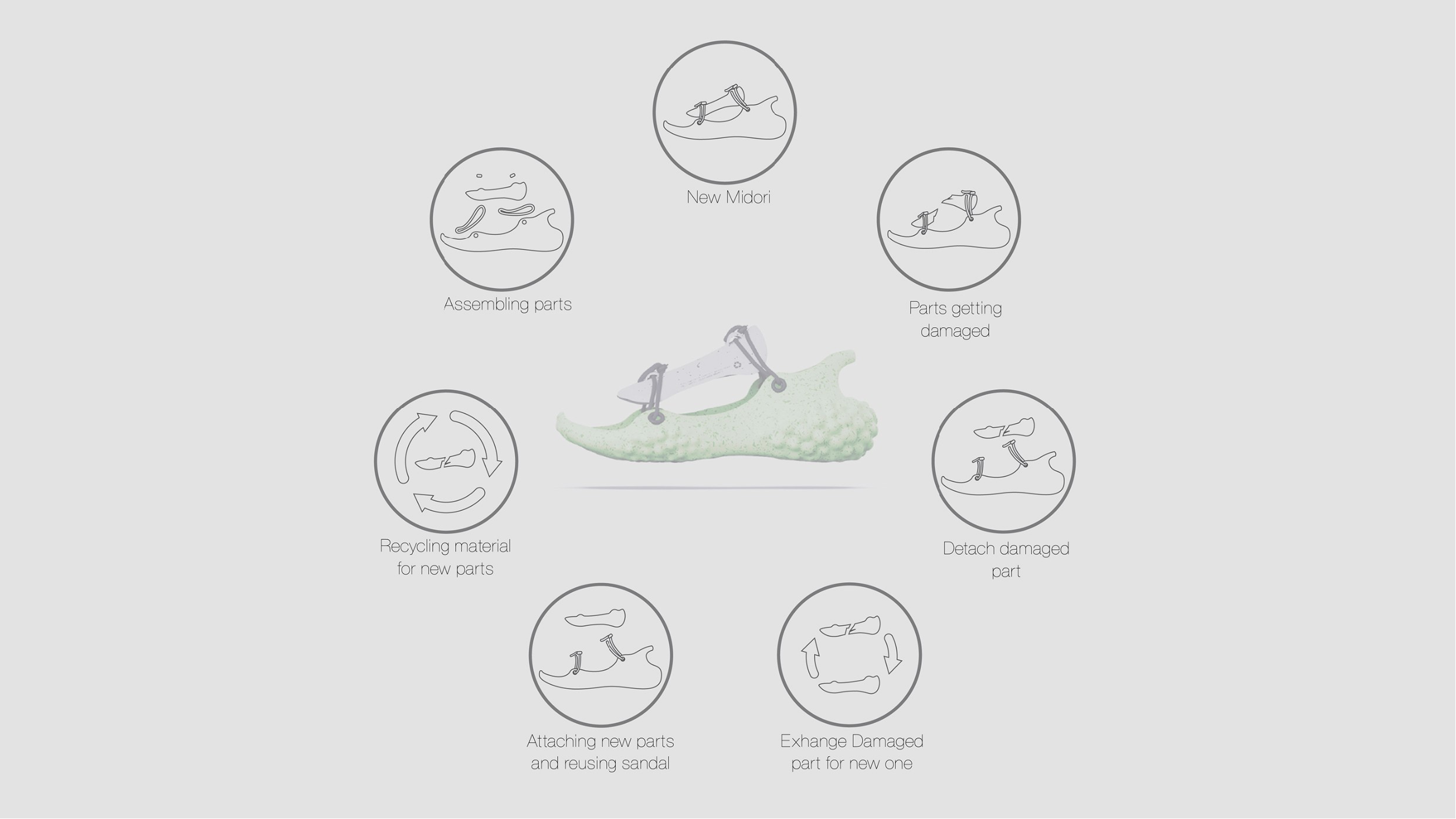 Midori is a footwear design project focused on sustainable sandals. The design addresses the typical wear and tear of everyday footwear through a modular approach. Each part of the sandal is customizable and replaceable, creating a sustainable lifecycle that withstands rough use.